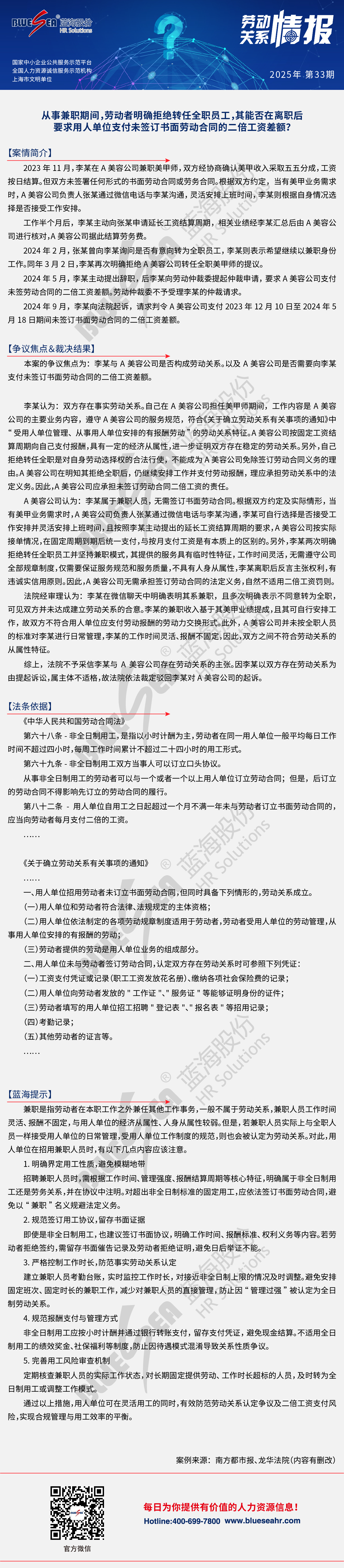 从事兼职期间,劳动者明确拒绝转任全职员工,其能否在离职后要求用人单位支付未签订书面劳动合同的二倍工资差额?