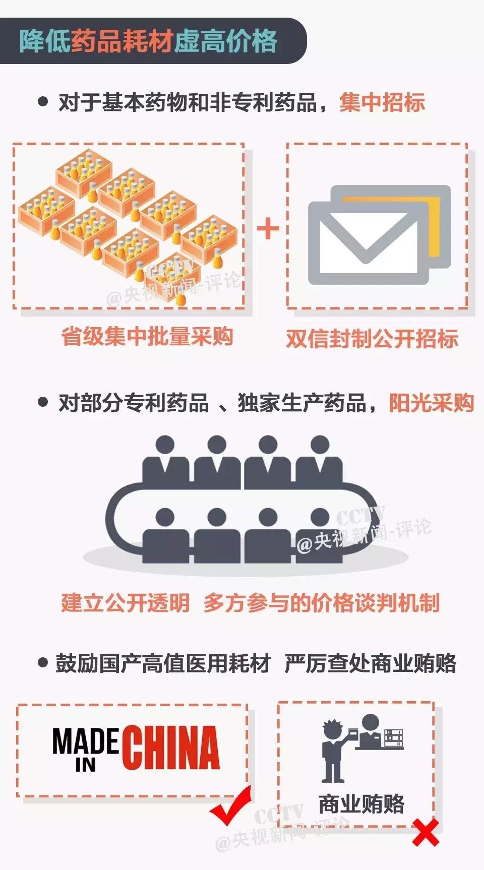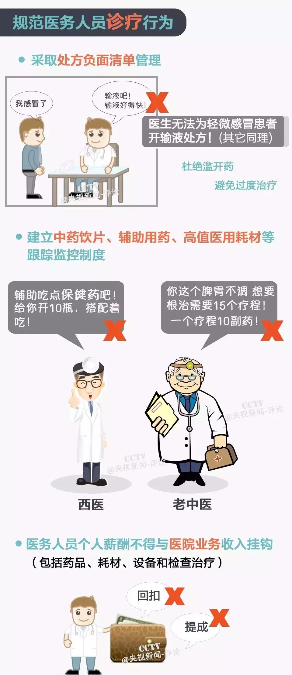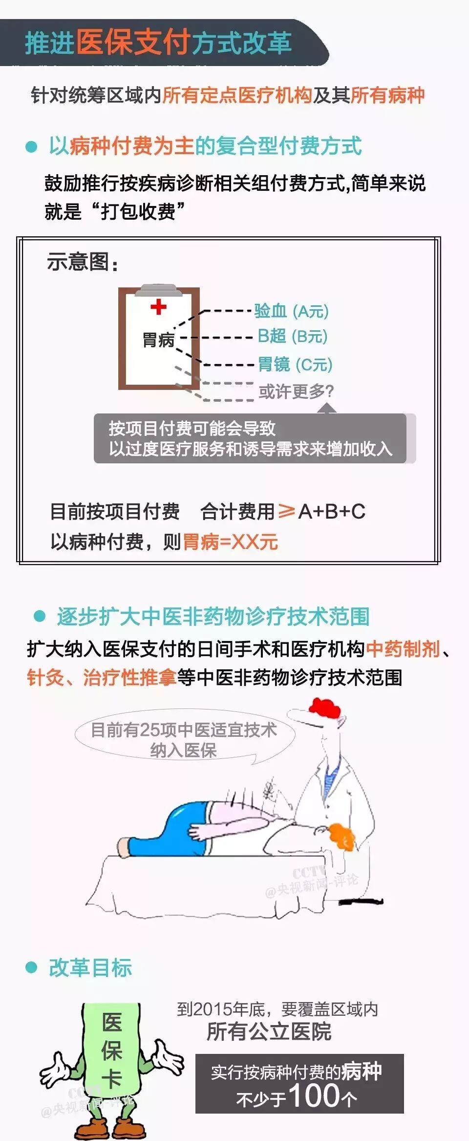 一、杜绝滥开药,避免过度治疗 二、医务人员个人薪酬不得与医院业务收入挂钩 三、对于基本药物和非专利药品集中招标 四、对部分专利药品、独家生产药品阳光采购 五、按病种“打包”收费,取代按项目累计收费 六、更多中医非药物诊疗技术如“推拿”、“针灸”等纳入医保 详情看图解: 1、强化医疗机构内控制度,提高内部运行效率; 2、严格控制公立医院规模,严禁公立医院举债建设,严格控制建设标准。 3、破除以药补医,建立公立医院科学的补偿机制; 4、构建分级诊疗体系,提高医疗服务体系的整体效率; 5、实施全民健康促进和健康管理,从源头上控制医疗费用增长。 意见要求,将控制公立医院医疗费用不合理增长作为深化医改的重要目标和任务,并提出了费用控制的阶段性目标: 1、2016年上半年,初步建立公立医院医疗费用监测体系,医疗费用不合理增长的势头得到初步遏制。 2、2017年底,公立医院医疗费用控制监测和考核机制逐步建立健全,参保患者医疗费用中个人支出占比逐步降低,居民看病就医负担进一步减轻。 |